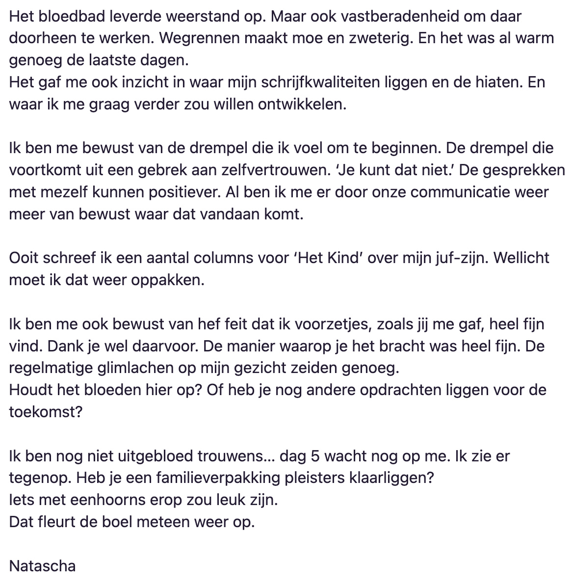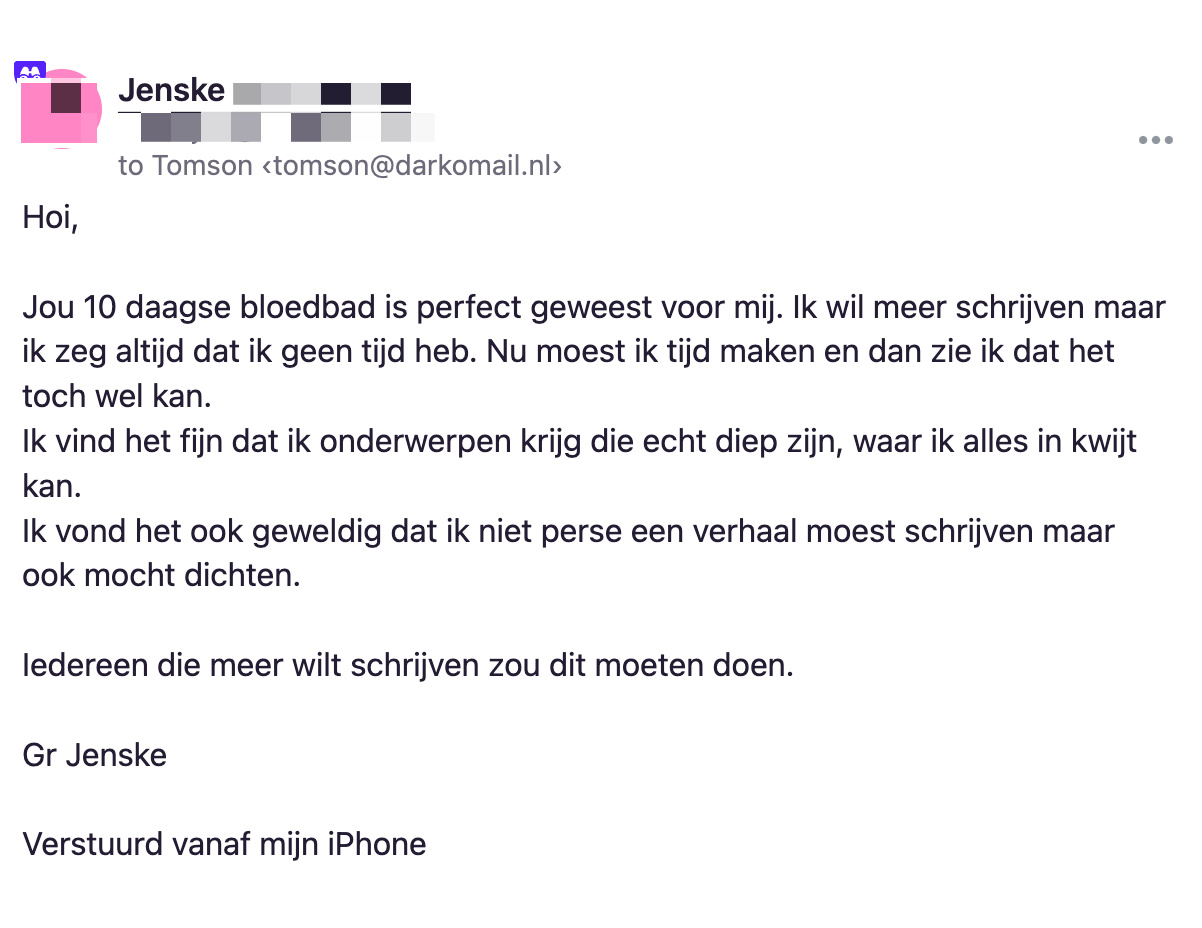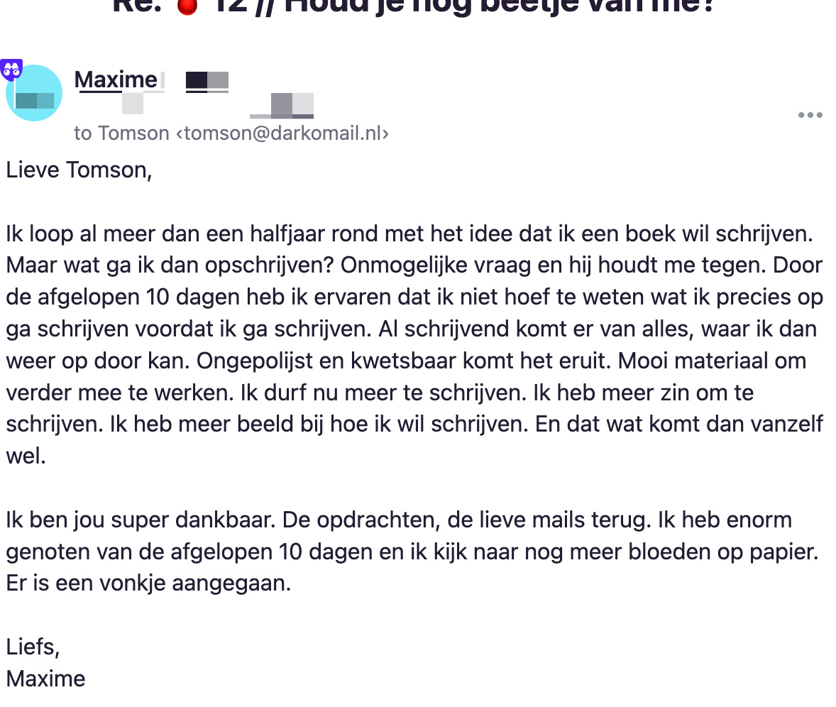 Na inschrijving krijg je binnen vijf minuten de eerste e-mail. Daarin staat een link. Als je op die link klikt, krijg je de eerste schrijfopdracht binnen. Vervolgens heb je 24 uur om die uit te voeren.Let op: het begint pas als jij wil dat het begint, door te klikken op die link in de eerste e-mail. Je kan dus gerust nog een paar uur of paar dagen wachten.De meest uitgebreide oefeningen krijg je op dag 1 en 2. Omdat de ervaring leert dat je dan nog vol energie en inspiratie zit.Daarna worden de oefeningen iets makkelijker om je gemotiveerd te houden en het niet als huiswerk te laten voelen.Om vervolgens, als je er helemaal in zit, echt de diepte van je gevoelswereld op te zoeken en je flink te laten ‘bloeden’ en tot inzichten te brengen.De opdrachten die je schrijft, schrijf je voor jezelf. Wel vraag ik elke dag een ‘bewijsstuk’ dat je hebt gebloed. Om je scherp en gemotiveerd te houden. Bijvoorbeeld een foto van je notitieboekje. Of een inzicht dat je hebt opgedaan door het schrijven.Er is een mogelijkheid om één geschreven verhaal tijdens deze 10-daagse op te sturen naar mij.Als je wilt.In totaal ontvang je 14 dagen lang een mail van me. De eerste 10 dagen krijg je de schrijfopdrachten. Daarna borrelen we nog twee dagen na en geef ik je een bonusopdracht als afsluiter.Tot slot.De opdrachten zijn confronterend, leerzaam en helpen je om vertrouwd te raken met je gevoelens op papier zetten. Als je in het verleden al veel hebt geschreven, gaat dit je helpen om weer de motivatie te vinden.Voor 44,44 euro doe je mee.Na betaling ontvang je binnen vijf minuten de bevestigingsmail met de knop om de eerste schrijfopdracht te ontvangen.